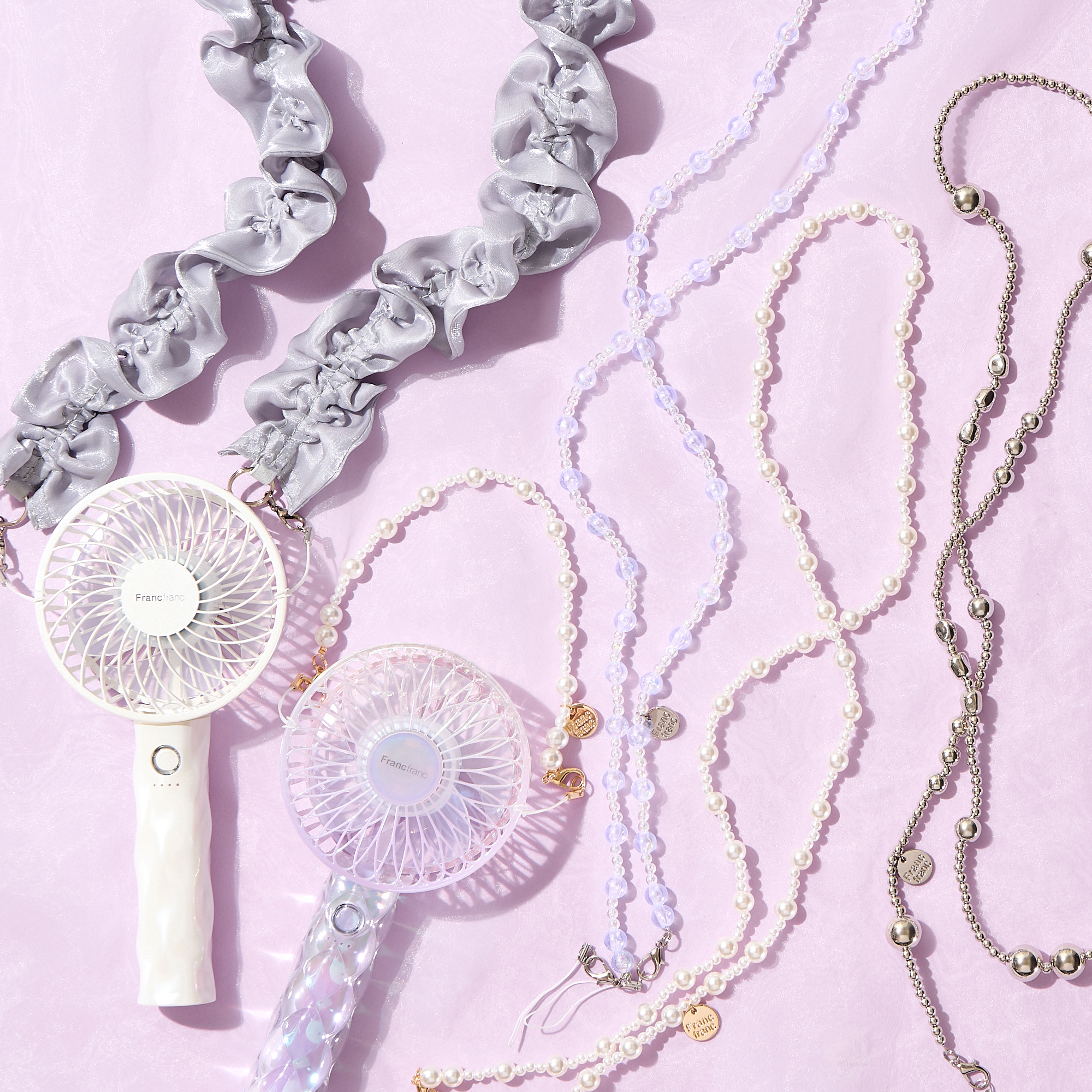 「フレ ハンディファン」シリーズ対応のネックストラップとハンドストラップです。金具を繋げてマルチストラップとして、またハンドストラップはバッグストラップとしてもお使いいただけます。きれいめ派におすすめの高級感あるシンプルデザイン、ラメ×透明感でトレンド感たっぷりのフリル、夏の光に映える透明オーロラ、可愛らしさをプラスするパールなど、豊富なデザインをラインアップしました。夏のファッションアイテムとして、デザインやシーンに合わせて、自分らしいスタイルを楽しめます。 |