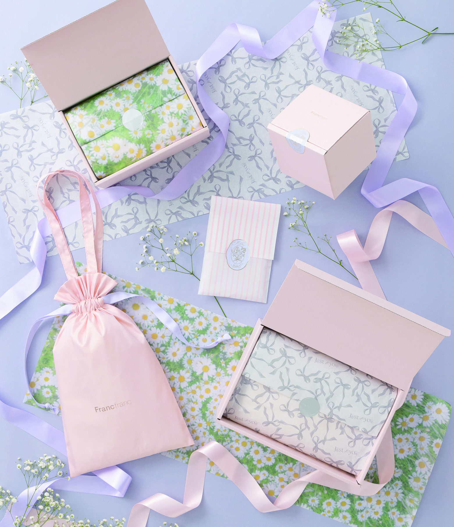 新デザインのギフトラッピング包材を、2026年1月23日(金)より全国のFrancfranc店舗※2およびFrancfrancオンラインショップ※3にて展開いたします。バレンタイン、母の日、クリスマス、誕生日──。一年を通じて訪れる、さまざまなギフトシーンに寄り添い続けてきたFrancfrancから、心高鳴る新デザインのラッピングが登場します。Francfrancのギフトラッピングは、これまでも多くのお客様にご愛用いただいてきました。贈る相手を想いながら、選ぶ時間そのものが特別なひとときとなるように。今回の新デザインでは、ギフトのサイズに合わせた豊富なラインナップ。さらに、もらった後もリユースできる巾着ギフトバッグや、開けた瞬間に心高鳴るデザインが施されているギフトボックスなど、受け取った人が思わず笑顔がこぼれるような、感動の仕掛けを随所に散りばめています。